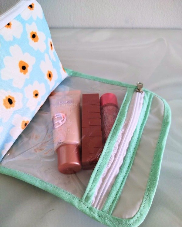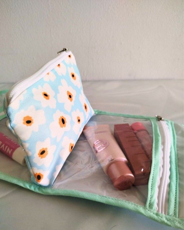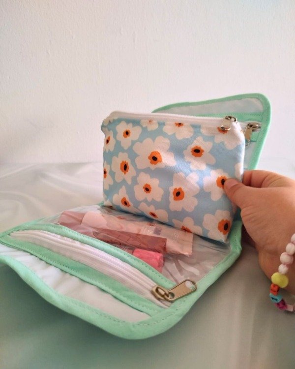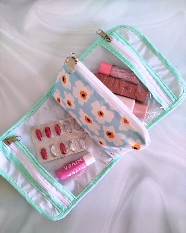 Cuenta con dos bolsillos transparentes con cierre (15x17cm aprox. c/u) y un mini neceser incorporado con cierre, impermeable por dentro (15x10cm aprox.). El exterior de este neceser es color celeste liso