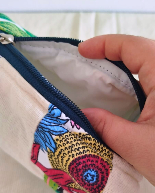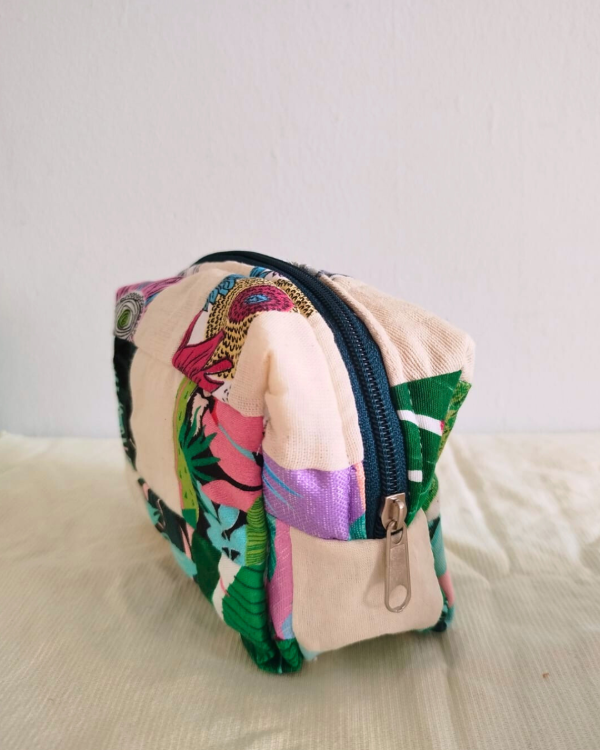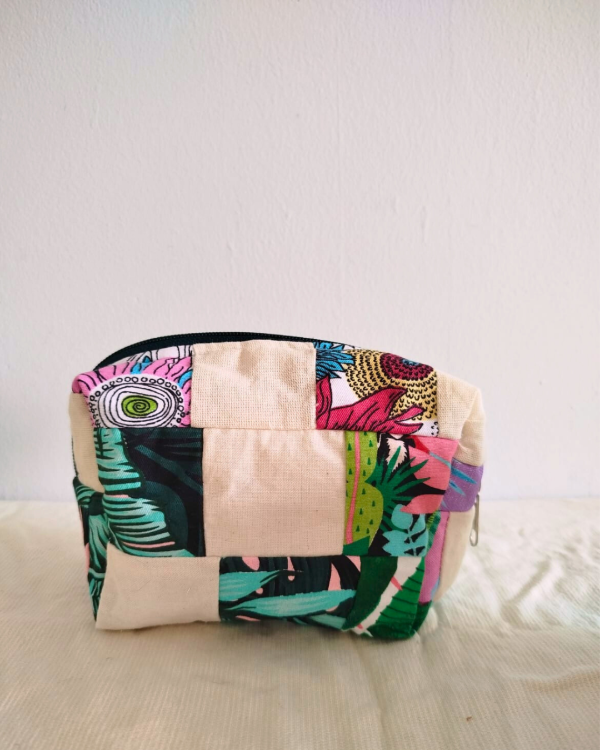 Neceser box confeccionado con retazos de distintos materiales y texturas, forrado en su interior con silver impermeable y con cierre con costuras reforzadas.