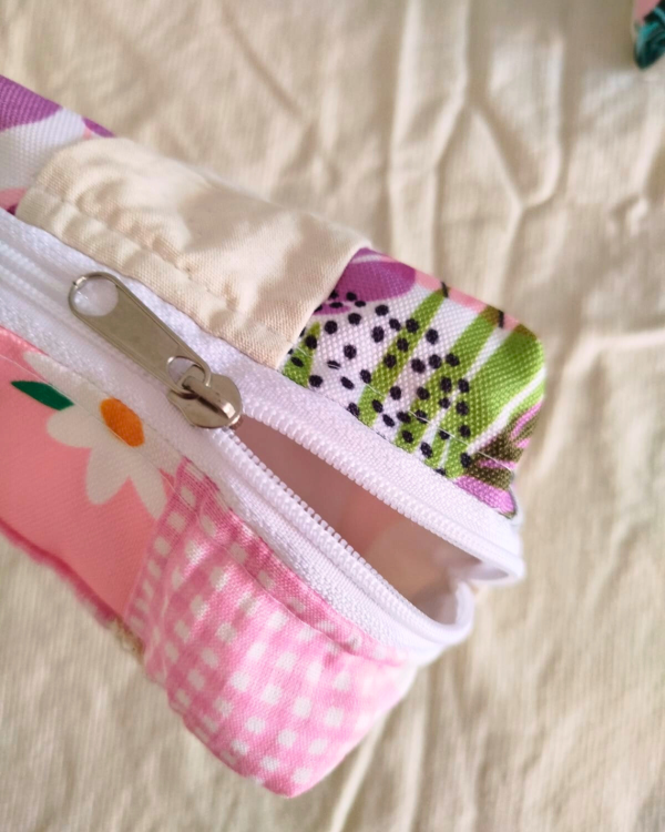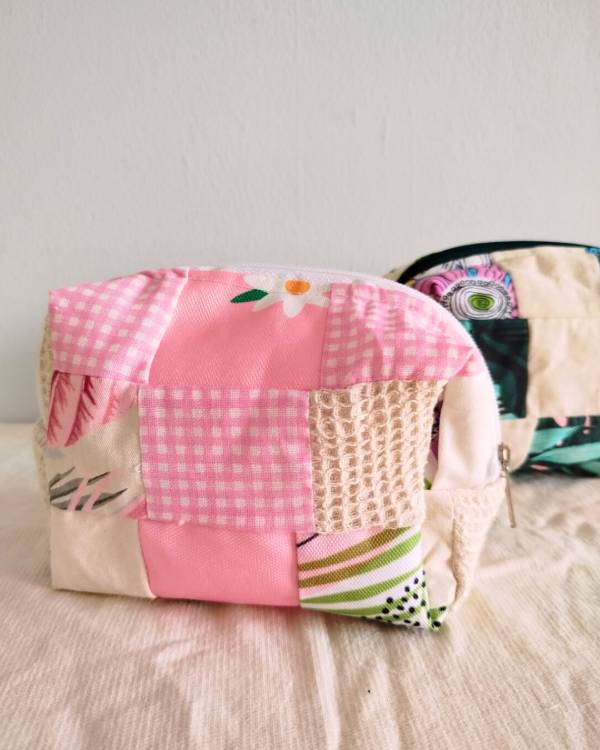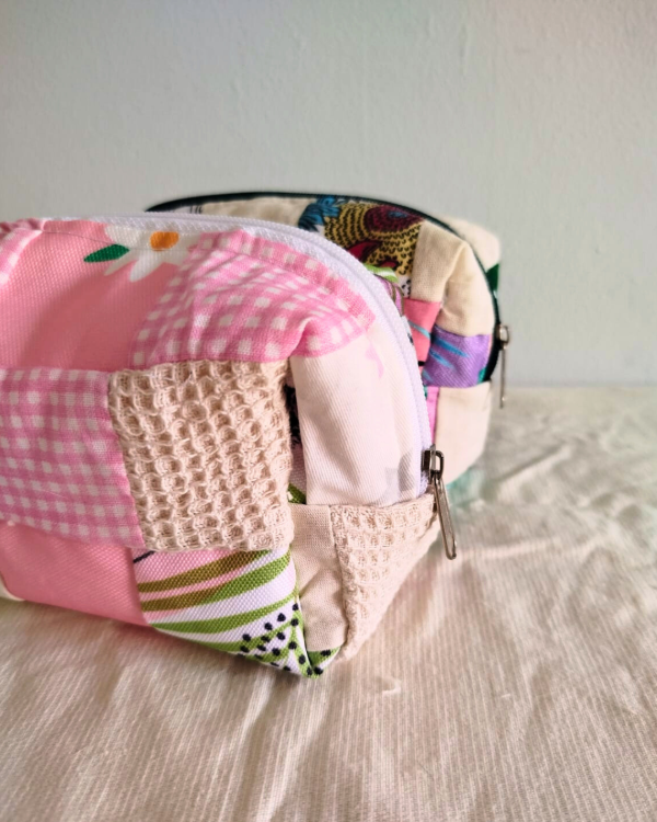 Neceser box confeccionado con retazos de distintos materiales y texturas, forrado en su interior con silver impermeable y con cierre con costuras reforzadas.